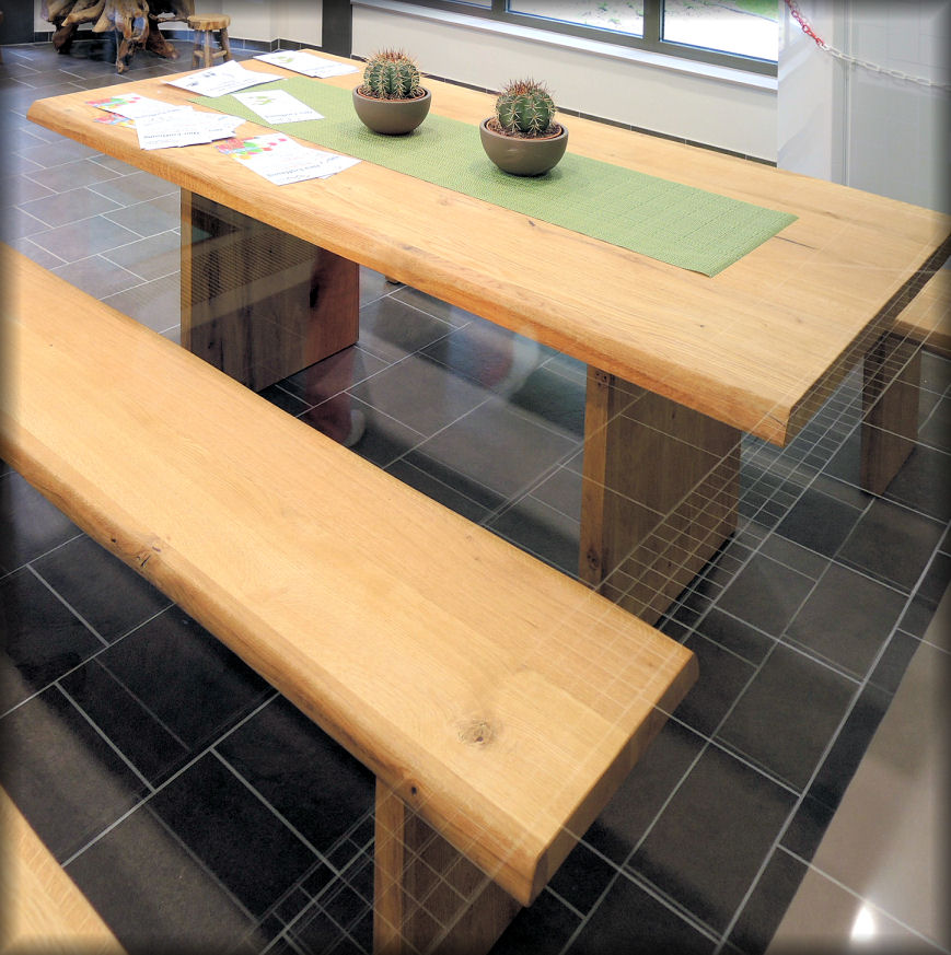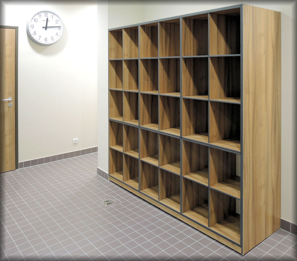 Die Schränke haben nur halbe Höhe, und die schmalen Bänke direkt vor den Schranktüren