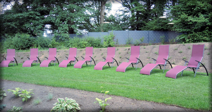 Der Saunagarten - frisch angelegt, daher noch ohne hohen Bewuchs.