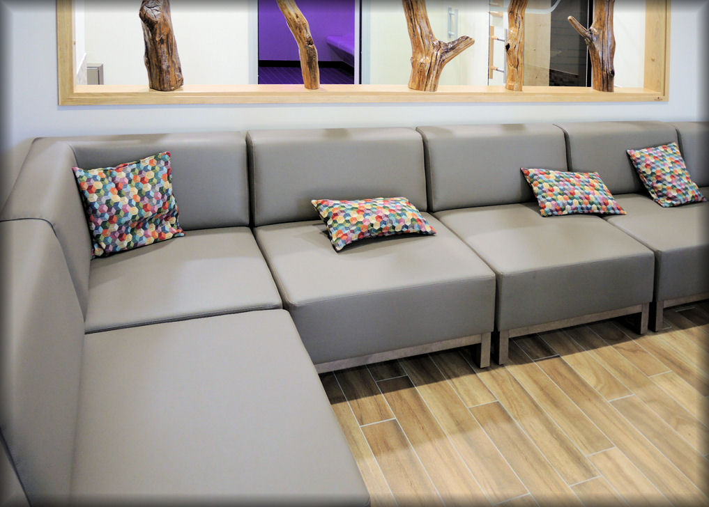 Im Eingangsbereich gibt es Sitzmöbel, wo Menschen warten oder sich treffen können.