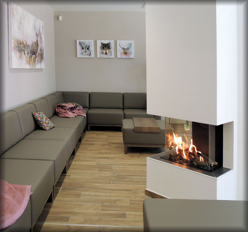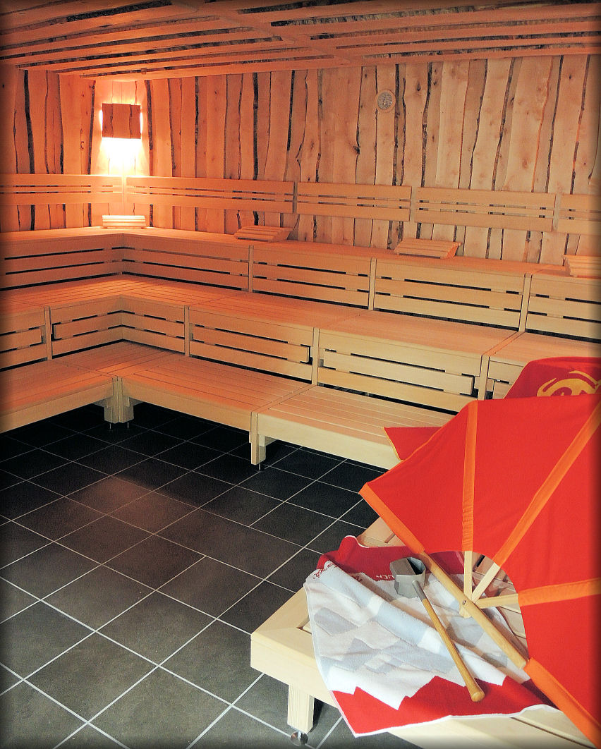 herrscht im großzügigen Sauna-Vorraum zum Entspannen und Warten.
