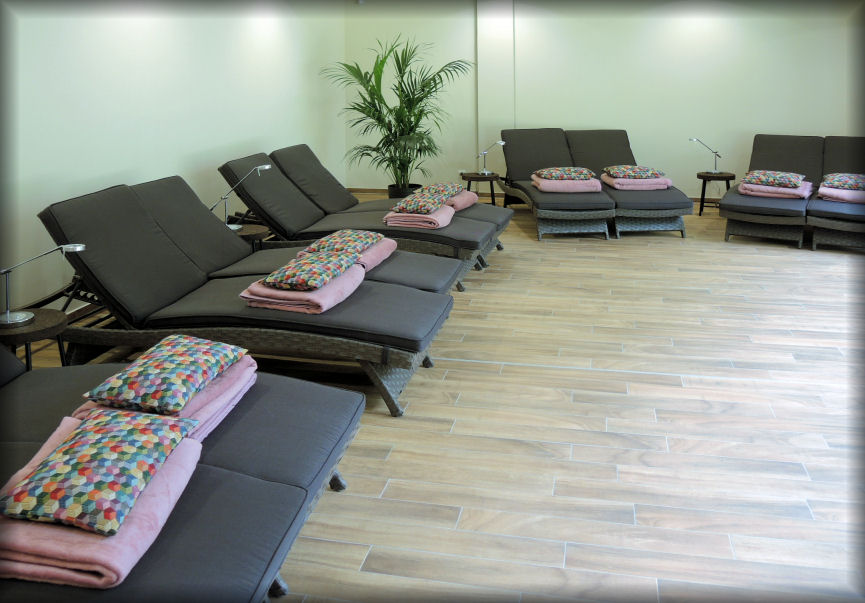 Der Sauna-Ruhebereich mit bequemen Liegen und Leseleuchten.