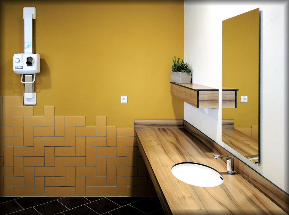 Das Bad ist durchweg barrierefrei, und für Rolli-Nutzer gibt es einen separaten Umkleideraum mit Dusche und Toilette.